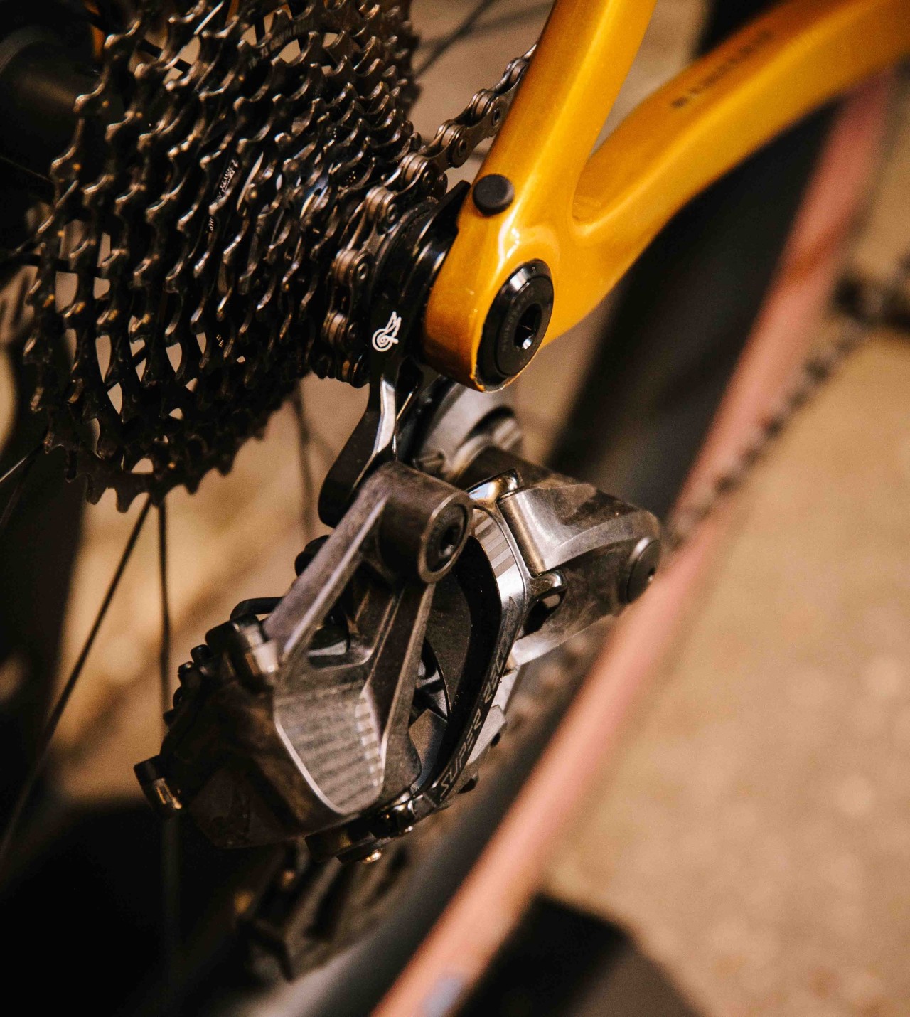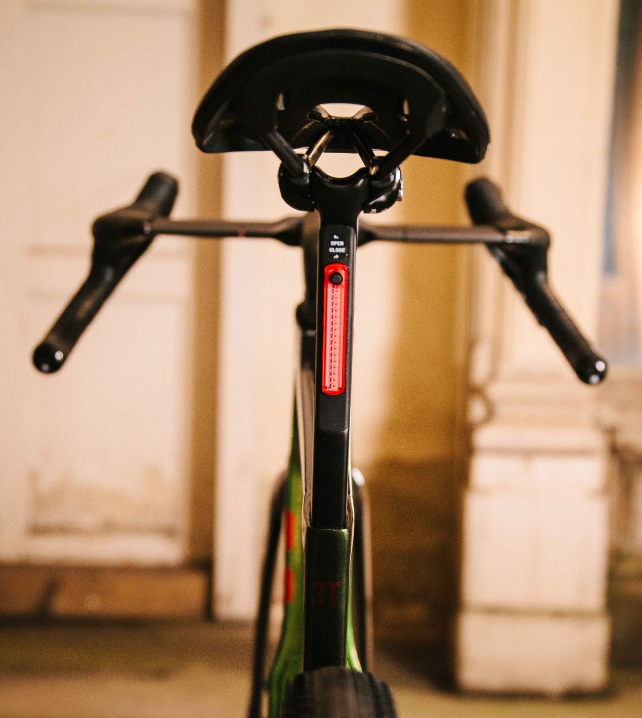 Für 2026 hat der Begründer der Kategorie Race Gravel Bikes mit dem Racemax² Italia ein weitgehendes Update erfahren. Der Rahmen wurde komplett erneuert. Es gibt mehr Reifenfreiheit, bis zu 51mm bei Einfachkettenblatt, ein trotz interner Kabelführung schmales Steuerrohr mit einer kleinen Aeronase, was rund 1,5% Leistungsgewinn gegenüber dem alten Modell bringt. Das Unterrohr ist am „Hals“ 55mm, am „Rumpf“ 75mm breit, um den Luftstrom auch bei den breiteren Reifen zu optimieren. Dann bekam des Unterrohr eine Rahmenbox, in der Ersatzteile und Werkzeug transportiert werden können. Mit Fidlock-Verschluss. Die Tasche, in der man die Utensilien im Rahmen verstaut, stammen vom italienischen Bike Packing Spezialisten Miss Grape und werden in Italien hergestellt. In der Sattelstütze ist ein abnehmbares Rücklicht für bis zu 15 Stunden Leuchtdauer verbaut. Im Steuersatz kommen die SLT Lager von CeramicSpeed aus Dänemark zum Einsatz. Die sind zuverlässig wie keine anderen, halten ewig, auch unter schwierigsten Bedingungen. Und was will man mehr von einem Steuersatz. Auch das Fahrverhalten wurde den hohen fahrtechnischen Anforderungen moderner Gravel Races angepasst. Das Steuerrohr ist steiler, der Hinterbau kürzer, was die Agilität des Rads verbessert. Dafür wurde das Tretlager etwas abgesenkt, um die Stabilität zu verbessern.
